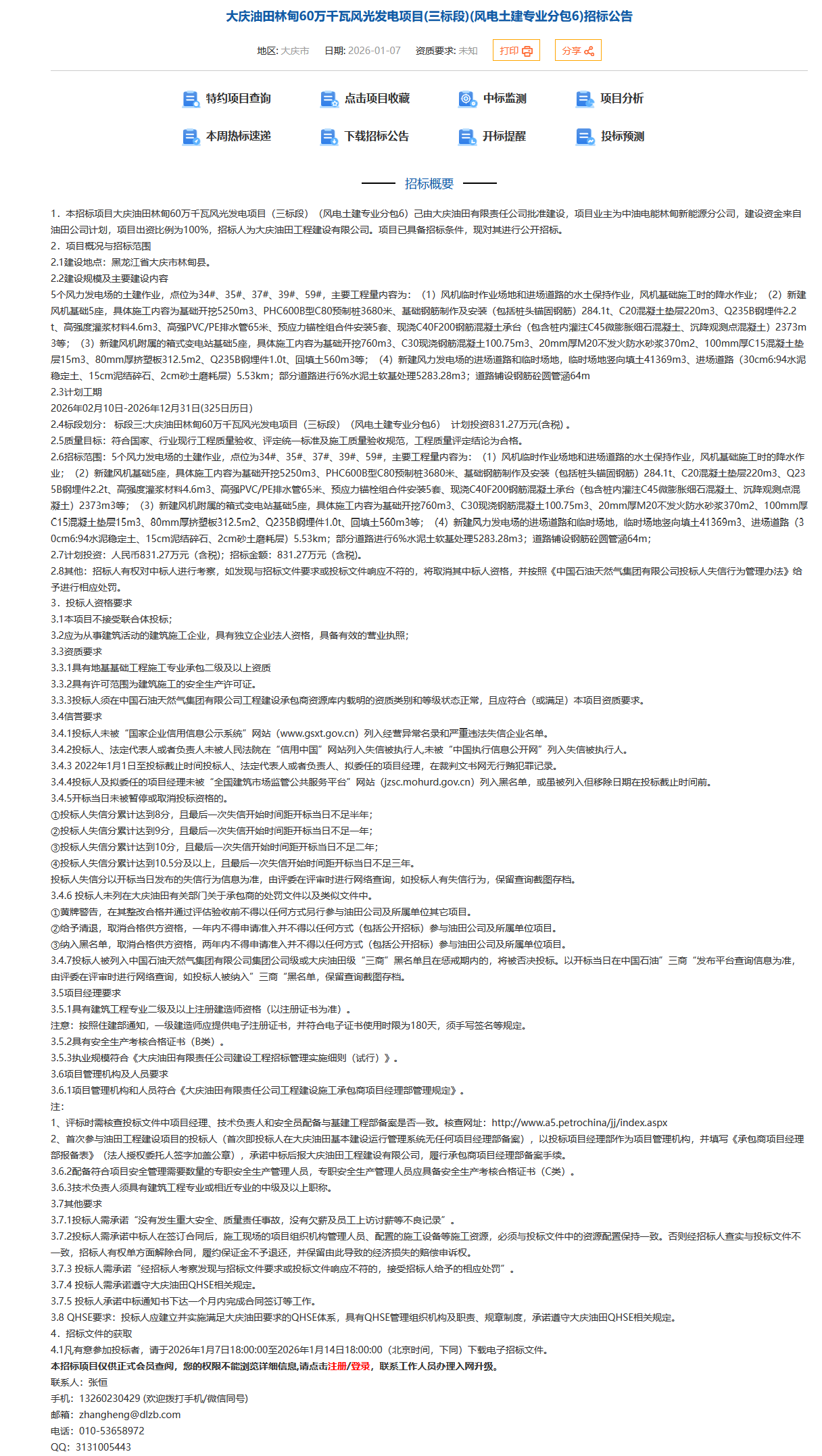 未被列入石油系统相关名单。不克不及正在失信名单内,质量需合适国度及行业尺度,扶植地址正在黑龙江省市林甸县。本次投标针对5个风力发电场(点位:34#、35#、37#、39#、59#)的土建工程。项目司理需有建建工程专业二级及以上注册建制师证书及平安出产查核及格证(B类),中国石油天然气集团公司旗下沉点项目——油田林甸60万千瓦风光发电项目正式启动环节标段投标工做,查看更多